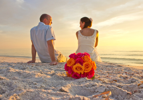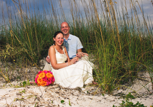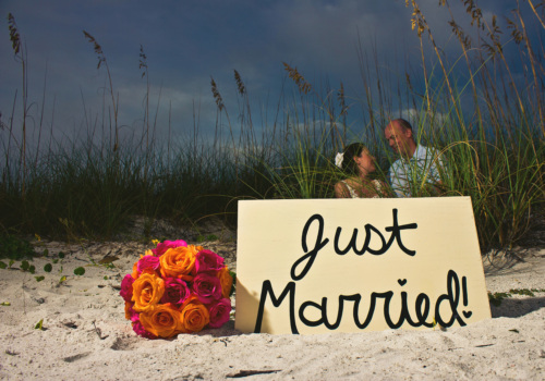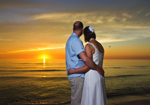 We hosted Vicky & Craig’s beach wedding September 25th on one of our favorite beaches, Pass-A-Grille, at the southern tip of St Pete Beach-rated #1 by Trip Advisor this year. They opted for our Just Add Love package, with fresh rose petals in a heart shaped sand sculpture. Vicky picked hot pink and orange roses for her bouquet, a stunning combination that nearly mirrored the skies as the sun set on their beach wedding. They had waited nearly 10 years to marry, and the carefree nature of their event was exactly what they had dreamed of. Traveling all the way from the UK, never before had they been to our beautiful St Pete Beaches, yet they assure me this will be on their list of places to visit again. Best wishes to our new English friends Vicky & Craig!