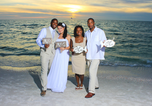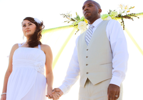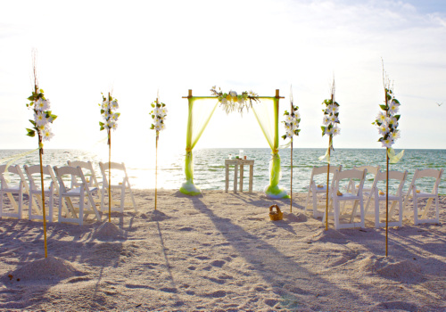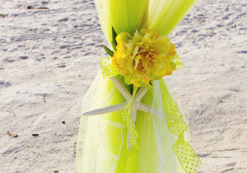 It was a small family affair on Pass-A-Grille Beach, as Anastasia & Johnnie married on Sept 29th. Local to Florida, they chose our Take A Bow two post arbor package, with green & yellow accents. Her dad walked her down the beach aisle, as she carried a beautiful yellow rose bouquet. It was a festive event, with recorded music and a fun group of friends and family. Congratulations Anastasia & Johnnie!