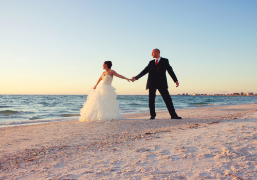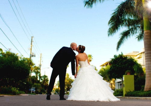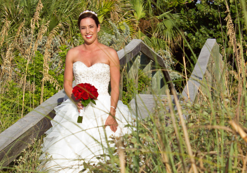 Craig planned the wedding, as we never spoke to Daisy till the day we met on the beach October 6th. Kudos to Craig! Dressed in a 3 piece suit, his red tie matched Daisy’s deep red rose bouquet and rose petals in the sculpted heart of sand of the Just Add Love beach wedding package. She wore a most elegant wedding dress that shimmered in the bright sunlight, and complimented her well dressed groom. Our photography shoot led us off Pass-A-Grille beach and into nearby gardens, capturing the multitudes of colorful Florida landscapes. It was a classy and romantic wedding, ending with a magnificent roaring red and orange sky. Wishing Daisy & Craig much happiness!