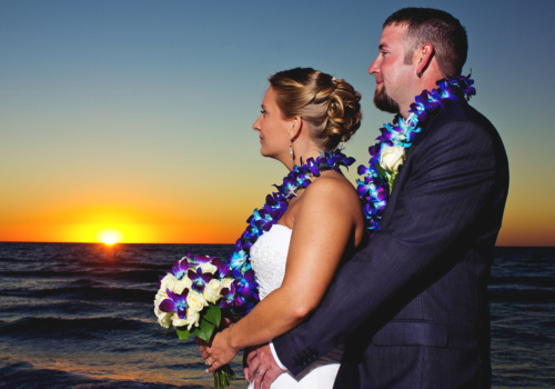 Dressed in formal wedding attire, Tracy & Greg enjoyed the beautiful Florida fall weather during their October 20th Pass-A-Grille Beach Wedding. Granted, the temps were still in the 80’s, but as the sun was setting, we could all feel the cooler fall air in the sea breeze. Tracy’s upgradedĀ bridal bouquet was stunning, a mix of fresh White Roses and Blue Bom orchids, and Greg wore a matching boutonniere. They added a pair of matching fresh Blue Bom Hawaiian orchid leis to top off the festivities and perfect for the reception party that followed. Pass-A-Grille Beach is one our favorite beaches, and now one of theirs! It was a classy affair, and we wish Tracy & Greg much happiness!