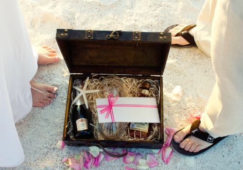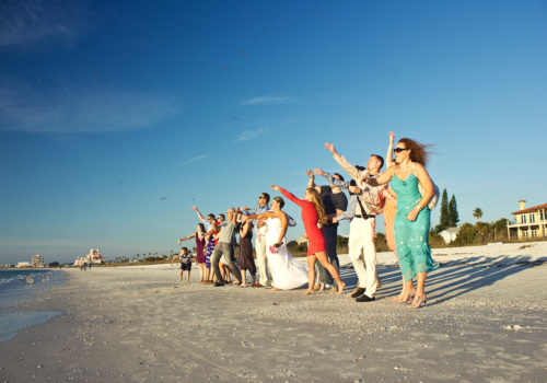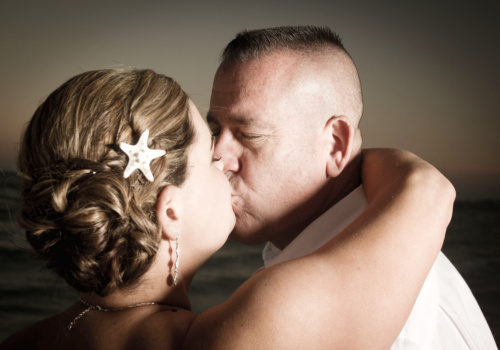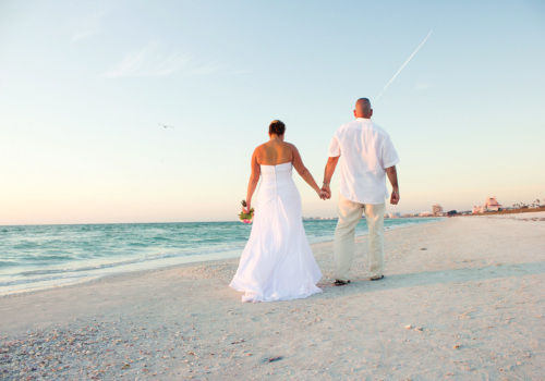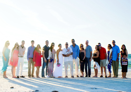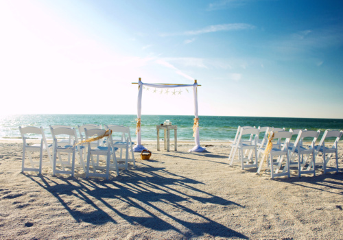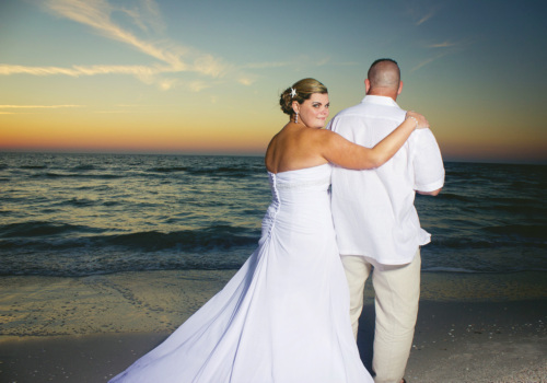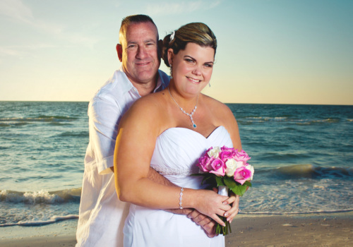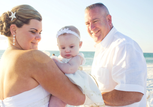 We were honored to marry Robyn and Wayne on the gorgeous Pass-A-Grille Beach just before sunset in late January. They “Tide the Knot” under a two-post bamboo arbor, wrapped in white fabric and accented with starfish decor, all part of the popular Love Me Knot package. They chose to add several upgrades to the package – white chairs, music, and the sand ceremony table. The couple also incorporated a new tradition into the ceremony with a “Love Note & Wine Box,” where the couple writes love notes to one another before the wedding, seals them in a box with wine, and agrees to open the box on their 5th anniversary! How fun! We wish Robyn, Wayne and their precious, baby girl a lifetime of happiness! Congratulations!