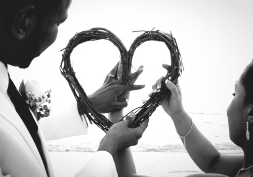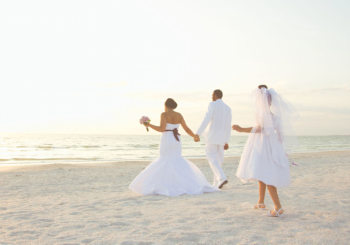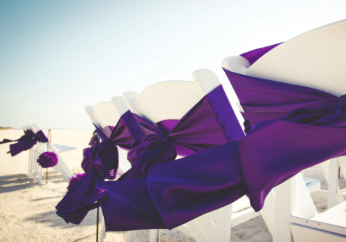 Featuring another new and fabulous color combination, we used deep purples with a splash of red to spotlight this Lucky in Love wedding package for our bride and groom, Marina and Keith. We also accented the white garden chairs with deep purple sashes, placed matching kissing balls down the aisle, and their daughter, the flower girl, scattered light purple rose petals along the sandy path. Marina, Keith and their daughter shared in the sand ceremony celebration, joining together this wonderful family of three. Elegantly dressed in formal attire, the bride and groom were joined by their loved ones, and enjoyed a beautiful sunset ceremony by the edge of the water on Pass-a-Grille beach. Congratulations, Keith and Marina!