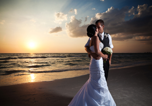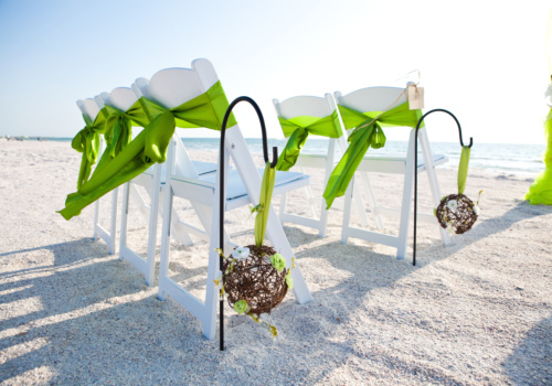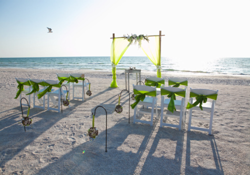 We love the green in this Take a Bow arbor package, with kissing balls hanging from shephards hooks and matching green chair sashes to tie it all together! Our beautiful couple, Elizabeth and Shannon, joined us from South Florida to say their “I Do’s” on the tranquil Pass-a-Grille Beach, the southernmost part of St. Pete Beach. They upgraded to include the sand ceremony table and garden chairs in their celebration, and Elizabeth carried a bouquet of pure white roses. The weather was perfect on this evening, and the sunset lit up the sky for some amazing wedding photography! Following their beach wedding, the happy couple joined by their guests retreated to the Black Palm Restaurant on Pass-a-Grille for an upscale dinner. It was an April 16th they’ll always remember! Wishing you lots of joy and happiness, Elizabeth and Shannon!