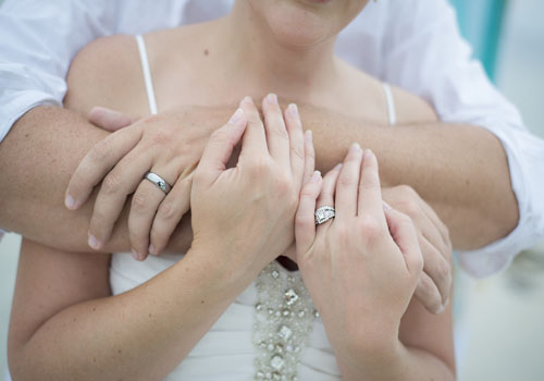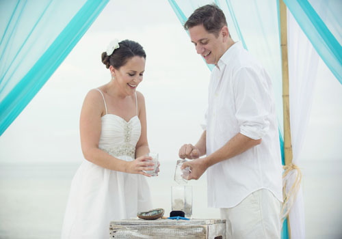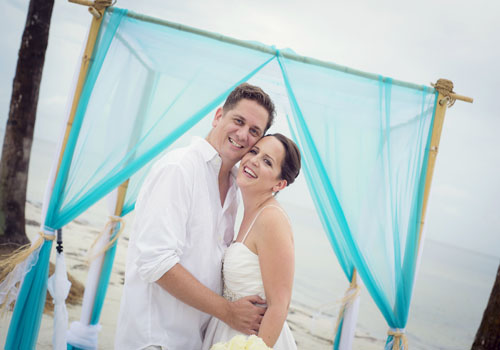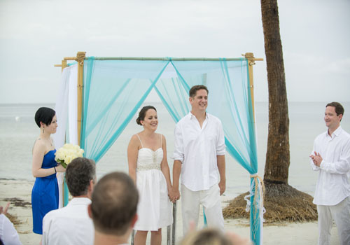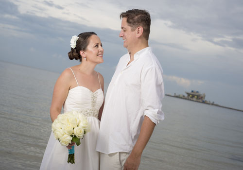 Our couple really wanted to marry in North Shore Park, located near the Vinoy Renaissance Resort in Downtown St. Petersburg, then ventured out for a reception dinner in downtown. This is a fun and trendy area situated on the bay, with boutique hotels, tons of outdoor restaurants and shopping, the historic St. Pete Pier, and sailboats galore – all within a twenty minute drive to the beaches! Christina and Mark are local residents, and this wedding location was particularly sentimental to them. With the Lucky in Love package, we decorated the 4 post arbor in turquoise and white fabric, then formed a traditional aisle with matching kissing balls dangled from shepherds hooks, and accented the white chairs with colorful sashes. With talks of the city tearing down the historic Pier, Christina and Mark were thankful to capture many wedding photos with the Pier in the background. Congratulations, Christina and Mark!